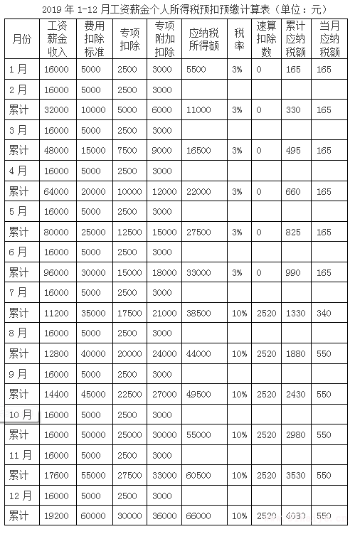 根據(jù)規(guī)定,自2019年1月1日起,居民個人取得綜合所得,按年計算個人所得稅,有扣繳義務(wù)人的,由扣繳義務(wù)人按月或者按次預(yù)扣預(yù)繳稅款。綜合所得,包括工資、薪金所得、勞務(wù)報酬所得、稿酬所得、特許權(quán)使用費所得。居民個人工資薪金所得適用累計預(yù)扣法,什么是累計預(yù)扣法?工資收入如何扣繳個人所得稅?舉個例子來說明。 張女士在某企業(yè)任職,2019年1月-12月每月在某企業(yè)取得工資薪金收入16000元,無免稅收入;每月繳納三險一金2500元,從1月份開始享受子女教育和贍養(yǎng)老人專項附加扣除共計3000元,無其他扣除。請計算張女士個人所得稅預(yù)扣預(yù)繳情況明細(xì)。 在計算之前我們要了解居民個人工資、薪金所得應(yīng)納稅額的計算公式和個人所得稅預(yù)扣率表。如下: 本期應(yīng)預(yù)扣預(yù)繳稅額=(累計預(yù)扣預(yù)繳應(yīng)納稅所得額×預(yù)扣率-速算扣除數(shù))-累計減免稅額-累計已預(yù)扣預(yù)繳稅額 累計預(yù)扣預(yù)繳應(yīng)納稅所得額=累計收入-累計免稅收入-累計減除費用-累計專項扣除-累計專項附加扣除-累計依法確定的其他扣除 計算過程: (1)2019年1月 1月累計預(yù)扣預(yù)繳應(yīng)納稅所得額=累計收入-累計免稅收入-累計減除費用-累計專項扣除-累計專項附加扣除-累計依法確定的其他扣除=16000-5000-2500-3000=5500,對應(yīng)稅率為3%。 1月應(yīng)預(yù)扣預(yù)繳稅額=(累計預(yù)扣預(yù)繳應(yīng)納稅所得額*預(yù)扣率-速算扣除數(shù))-累計減免稅額-累計已預(yù)扣預(yù)繳稅額=5500*3%=165元 2019年1月,企業(yè)在發(fā)放工資環(huán)節(jié)預(yù)扣預(yù)繳個人所得稅165元。 (2)2019年2月 2月累計預(yù)扣預(yù)繳應(yīng)納稅所得額=累計收入-累計免稅收入-累計減除費用-累計專項扣除-累計專項附加扣除-累計依法確定的其他扣除=16000*2-5000*2-2500*2-3000*2=11000元,對應(yīng)稅率3%。 2月應(yīng)預(yù)扣預(yù)繳稅額=(累計預(yù)扣預(yù)繳應(yīng)納稅所得額*預(yù)扣率-速算扣除數(shù))-累計減免稅額-累計已預(yù)扣預(yù)繳稅額=11000*3%-165=165元 2019年2月,企業(yè)在發(fā)放工資環(huán)節(jié)預(yù)扣預(yù)繳個人所得稅165元。 按照上述方法以此類推,計算得出張女士12個月的個人所得稅預(yù)扣預(yù)繳情況明細(xì)表。 你會計算工資薪金個人所得稅預(yù)扣預(yù)繳數(shù)額了么? |