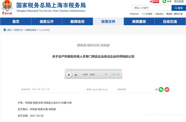 關于生產(chǎn)和裝配傷殘人員專門用品企業(yè)免征企業(yè)所得稅的公告 文號:財政部 稅務總局 民政部公告2021年第14號 發(fā)文單位:財政部 稅務總局 民政部 發(fā)文日期:2021-04-02 為幫助傷殘人員康復或者恢復殘疾肢體功能,現(xiàn)對生產(chǎn)和裝配傷殘人員專門用品的企業(yè)免征企業(yè)所得稅政策明確如下: 一、自2021年1月1日至2023年12月31日期間,對符合下列條件的居民企業(yè),免征企業(yè)所得稅: 1.生產(chǎn)和裝配傷殘人員專門用品,且在民政部發(fā)布的《中國傷殘人員專門用品目錄》范圍之內(nèi)。 2.以銷售本企業(yè)生產(chǎn)或者裝配的傷殘人員專門用品為主,其所取得的年度傷殘人員專門用品銷售收入(不含出口取得的收入)占企業(yè)收入總額60%以上。 收入總額,是指《中華人民共和國企業(yè)所得稅法》第六條規(guī)定的收入總額。 3.企業(yè)賬證健全,能夠準確、完整地向主管稅務機關提供納稅資料,且本企業(yè)生產(chǎn)或者裝配的傷殘人員專門用品所取得的收入能夠單獨、準確核算。 4.企業(yè)擁有假肢制作師、矯形器制作師資格證書的專業(yè)技術人員不得少于1人;其企業(yè)生產(chǎn)人員如超過20人,則其擁有假肢制作師、矯形器制作師資格證書的專業(yè)技術人員不得少于全部生產(chǎn)人員的1/6。 5.具有與業(yè)務相適應的測量取型、模型加工、接受腔成型、打磨、對線組裝、功能訓練等生產(chǎn)裝配專用設備和工具。 6.具有獨立的接待室、假肢或者矯形器(輔助器具)制作室和假肢功能訓練室,使用面積不少于115平方米。 二、符合本公告規(guī)定條件的企業(yè),按照《國家稅務總局關于發(fā)布修訂后的<企業(yè)所得稅優(yōu)惠政策事項辦理辦法>的公告》(國家稅務總局公告2018年第23號)的規(guī)定,采取“自行判別、申報享受、相關資料留存?zhèn)洳椤钡霓k理方式享受稅收優(yōu)惠政策。 財政部 稅務總局 民政部 2021年4月2日 |
